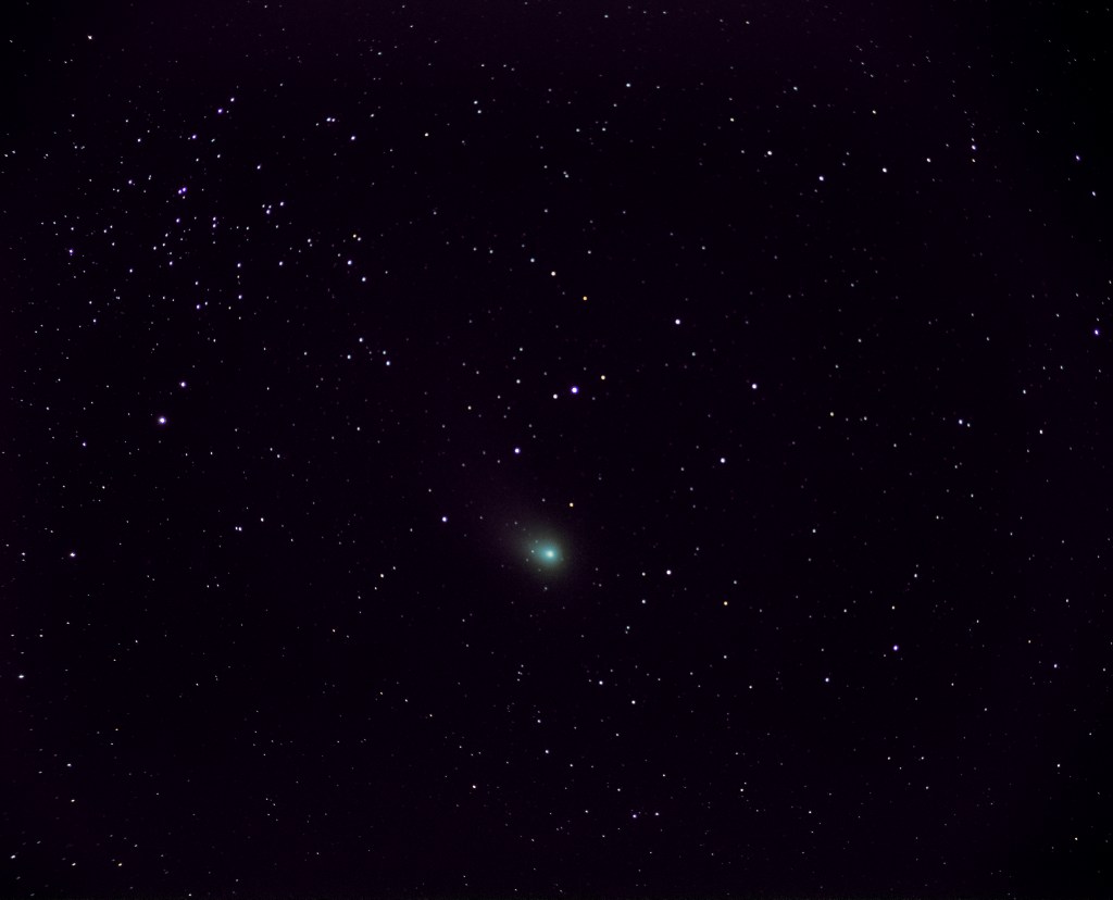Our planet had a brief visitor the past couple months who promises to be back in about 50,000 years. if you missed this green guy, stay tuned. I figured I might not make it for another multi-thousand centuries so I better try for a selfie. Well, the selfie part didn’t work, however, in spite of the crappy weather here in northeast Ohio, I did manage a portrait of the comet more affectionally know as C/2022 E3 (ZTF). It zipped past the sun in January and started headed for really outer space when I caught up with it on February 14. It’s traveling at around 156,000 miles per hour so you have to look quick. It’s green because of sunlight interacting with carbon and cyanogen in the comet’s head.