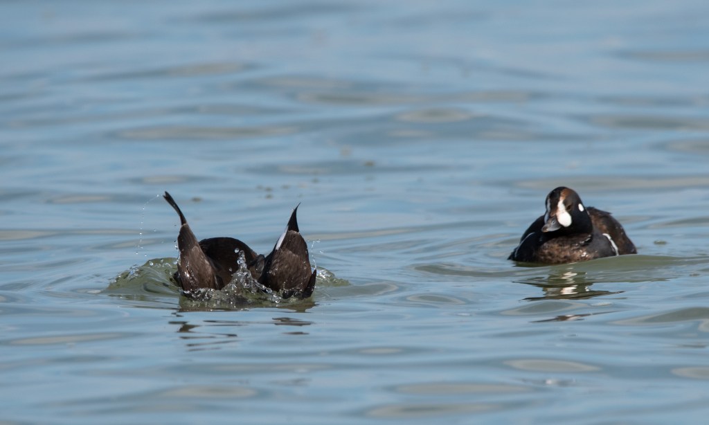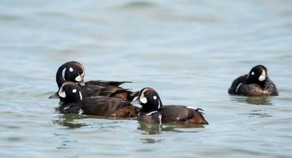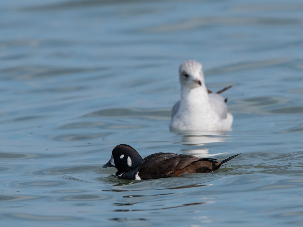 All is not lost, however. For the past couple months we’ve been able to enjoy the actions of four Harlequin Ducks. These birds come here, thinking it’s like the Florida Keys. Their presence borders on rare for this area, certainly, uncommon. This quartet has been near Rocky River Park where, apparently, the eats are good. While Susan and I watched, they seemed to be feeding on Zebra Muscles. Occasionally a duck would spit out a snail and the opportunistic gulls would be after it like a chicken on a June bug—so to speak. This group is in winter, or non-breading, plumage, a spectacular mix of white spots, along with shades of brown and black.