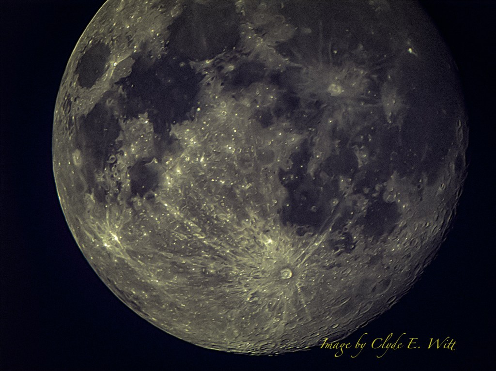 The last full moon of the winter season was/is bright and shiny tonight. I say was/is because here in northeast Ohio you take advantage of clear sky when you can get it. Thus, I was out last night (March 5) photographing the moon because the weather gods were not going to smile upon us for the real full moon, March 6. Okay, not to put too fine a point on this, technically, the moon will be full at 7:42 am on March 7. It looks full for a day on either side of the actual moment of fullness. I was out early in the evening, trying out a new piece of equipment and subsequently whacked off part of the moon’s head. Sorry Luna. From this image, however, you’ll get the picture. It’s made from a stack of about 1,000 separate images shot with my ZWO ASI 224 MC astro camera, and Explore Scientific ED80CF scope, stacked in ASI’s stacking program. Needless to say, I like the results. It was also shot when the moon was low so I picked up some of the golden hour glow.